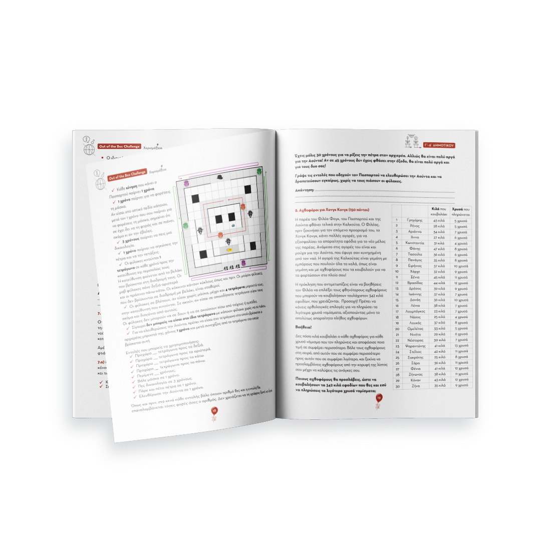 Επιστράτευσε την επιμονή, τη συγκέντρωση, την κρίση και τη φαντασία σου, και ξεκίνα αυτό το συναρπαστικό ταξίδι! Στο βιβλίο αυτό θα βρεις τα θέματα του Out of the Box Challenge, του πρώτου μαθητικού διαγωνισμού δημιουργικότητας και κριτικής ικανότητας για παιδιά Γ΄ και Δ΄ Δημοτικού και για παιδιά Ε΄ και ΣΤ΄ Δημοτικού, χωρισμένα ανά ηλικιακή κατηγορία.